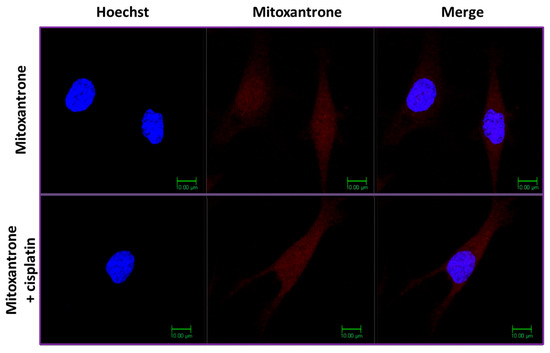 Confocal microscopy images of SKOV-3 cells treated with mitoxantrone (1 μΜ for 6 h) at 37 °C, in the presence or absence of cisplatin. Cisplatin was added to the cells 1 h before their incubation with mitoxantrone. At the end of the incubation, the cell nuclei were stained with the DNA-staining Hoechst 33342 dye and confocal fluorescent images were obtained after sequential excitation at 350 nm (for the Hoechst dye) and 638 nm (for the mitoxantrone). The emission filters of 461 nm and 650 nm–700 nm were used for collecting blue (Hoechst dye) and red (mitoxantrone) signals in separate channels. The left images show the nuclei staining with Hoechst dye (blue), whereas the middle ones depict the mitoxantrone fluorescence (red). The right images were created by merging the right and middle ones and depict the localization of mitoxantrone (red) in both the cytoplasm and the nuclei. The figures are shown from a representative experiment performed three times with similar results.