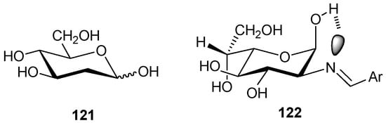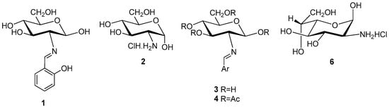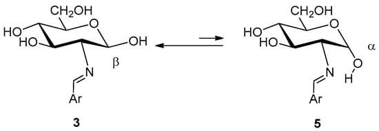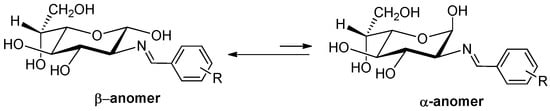 The first imine derived from 2-amino-2-deoxyaldoses (1) was reported in as early as 1913 [8,9,10]. Later on, Wacker and Fritz in 1967 [11] and Panov et al. in 1973 [12] prepared a series of imines (3) derived from 2-amino-2-deoxy-d-glucopyranose (2) with benzaldehydes and their per-O-acetyl derivatives (4), and demonstrated by 1H-NMR spectroscopy the appearance of equatorial anomers (β). In fact, with only one exception, all the known Schiff bases obtained from 2 and substituted benzaldehydes devoid of hydroxyl groups at the ortho position crystallize as β-anomers [13] (Chart 1). Certainly, this is a surprising and unexpected behavior because, in general, other aminoaldose derivatives show an axial stereochemistry (α-anomer), as a consequence of the anomeric effect.