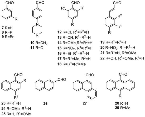 We employed as starting aminoaldoses the hydrochlorides of d-glucosamine (2) and 2-amino-2-deoxy-α-d-glycero-l-gluco-heptopyranose (6) [14,15,16], which were condensed with aldehydes derived from aliphatic and mono- and polynuclear aromatic hydrocarbons (Chart 2). Thus, the present study involves new Schiff bases obtained by reaction of benzaldehydes (7–18) with 2 and heptose 6, because for the latter, only the heptosimine derivative 37 had been described [17]. Since the lone electron pair on the nitrogen atom lies in the nodal plane of the unsaturated arylimino fragment, the substituents at the aromatic ring can only exert inductive electronic effects. Therefore, special interest has been paid to benzaldehydes (7–9, 12, 13) with strong electron-withdrawing groups (EWG), which would decrease the basicity of the nitrogen atom and weaken the hydrogen bond with the anomeric hydroxyl. On the other hand, the presence of electron-donating groups (EDG) would exert the opposite effect (10 and 11).