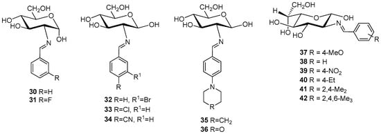 In the infrared (FT-IR) spectra of imines 30–42 and 50–58, the absorption of the C=N bond at ~1635–1650 cm−1 stands out. Both 1H and 13C NMR spectra support the assigned structures (Tables S1–S6 and S10–S12). Thus, the α-anomeric configuration of 30, 31, 52 and 54 is inferred from the low value of J1,2 (3.8 Hz) and by the downfield shift of H-1 and the upfield shift of the C-1 atom [13], relative to the corresponding signals for β-anomers. The rest of the imines show high coupling constants J1,2 (~7–9 Hz), consistent in all cases with the β-anomer. In addition, the IR spectra of cinnamylidene derivatives 45–49 also show the absorptions arising from the stretching vibration of the ethylene double bond at ~1620 cm−1. In the proton spectra, the signals of the iminic proton and those of the ethylene fragment should be mentioned, i.e., a doublet at ~7.1 ppm and double doublet at ~6.9 ppm. The large coupling constants between such protons (JCH=CH~16 Hz) indicate that the stereochemistry around the carbon double bond is trans (E). The high coupling constants J1,2 (~8.6 Hz) and the chemical shift of the anomeric carbon (δC1~95 ppm) point to an equatorial (β) disposition of the anomeric hydroxyl in all cases (Tables S7–S9).