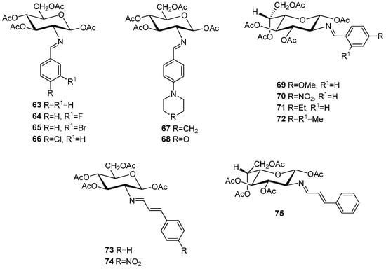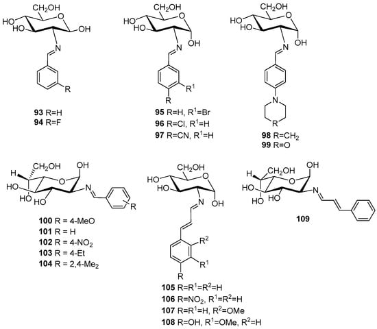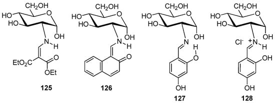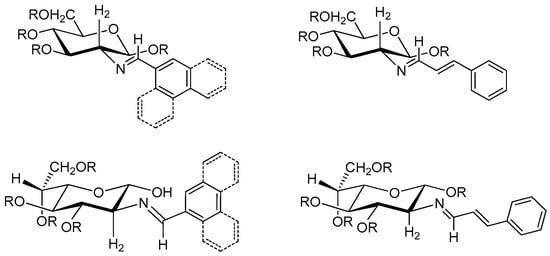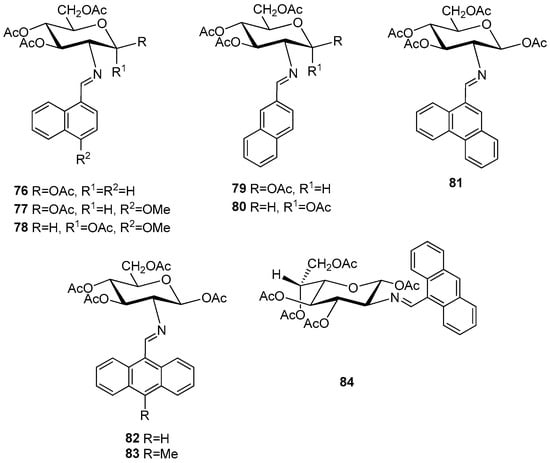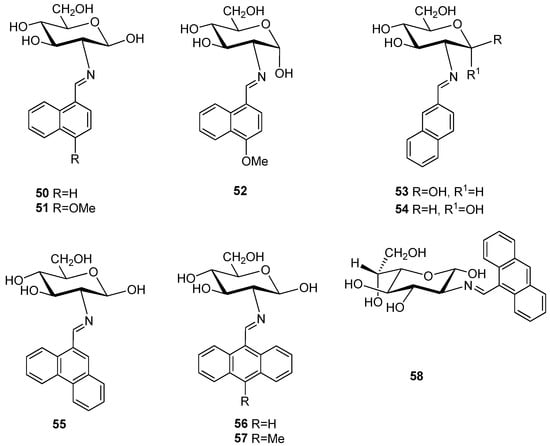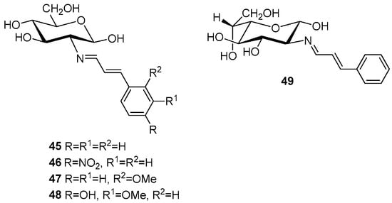 By using the cinnamylidene aldehydes 19–22, the corresponding β-anomers of Schiff bases 45–49 could be obtained as well (Chart 4). Compounds 45 [19], 46 [20], and 48 [20] were previously described.
