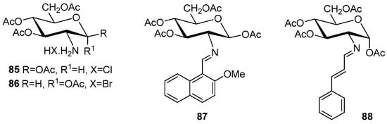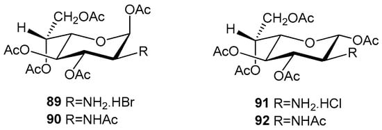 Alternatively, both α- and β-anomers of the per-O-acetyl imines derived from 2 could be obtained as pure anomers starting from the corresponding hydrohalides 85 [26] and 86 [27,28,29]. Accordingly, we were able to prepare 87, whose unprotected imine could not be isolated, or the α-anomers 80 and 88 (Chart 8). The homologous imines from 6 were likewise synthesized from the corresponding hydrohalides 89 [17] and 91 [17].
