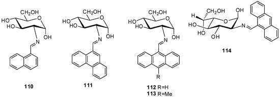 The mutarotational behavior of imines derived from 2 and 6 with aldehydes bearing fused aromatic rings is similar as well (110–114) (Chart 11). Most of them appear as the β-anomer (50, 51, 53, 55–58), although we were able to isolate two α-anomers (52 and 54). These compounds in solution slowly equilibrate with their β-anomers (88 and 89), which represent the dominant species (Figure 1). When the latter are allowed to evolve in solution, the final percentages of each anomer at equilibrium are approximately the same.