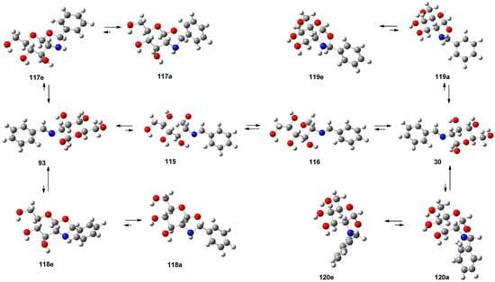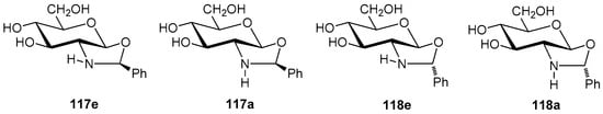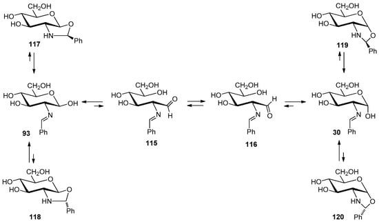 All the potential species involved in mutarotational equilibria (30, 93, 115, and 116) [52], and the heterocycles that could have been formed by reaction of the imino group with the anomeric hydroxyl (117–118), have been taken into account and are depicted in Scheme 6.