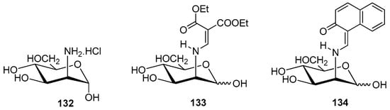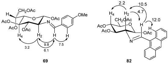 NOE experiments [40,41] carried out on compound 69 gave rise to the enhancements shown in Figure 3, which confirmed the proximity of H-2, the iminic hydrogen, and one of the ortho hydrogens at the aromatic ring, all consistent with a 1C4 (l-gluco) conformation and coincidental with that determined through NMR spectroscopic data. Similar NOE enhancements were observed for 82 having a 4C1 (d-gluco) conformation. The absence of a NOE effect between the H-1 and H-2 protons is in agreement with their β-configuration.