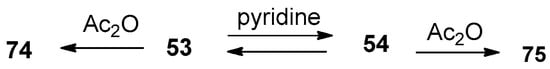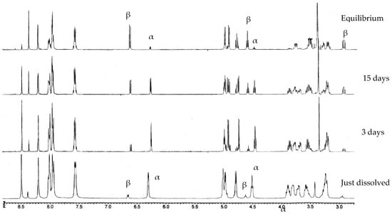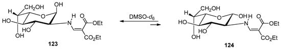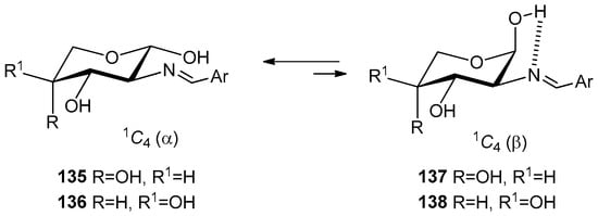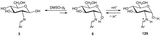 Table 1 shows the percentage variation for the β-anomer of some imines using DMSO-d6 and pyridine-d5 as solvents. In both cases, the results obtained are similar, although in pyridine the equilibration occurs faster. Probably the basic nature of this solvent is behind the rapid anomerization, since it is known that this phenomenon is sensitive to general acidic and basic catalysis [31]. This rapid anomerization in pyridine explains the failure to prepare per-O-acetylated α-anomers from α-imines, such as 30 and 31, or the formation of mixtures of both anomers (as happens with 52 and 54). The absence of typical oxazolidine signals at ~5–6 ppm and ~90–97 ppm [32,33,34,35,36,37], rules out the possibility of an equilibrium involving such five-membered heterocycles, which result from addition of the anomeric hydroxyl to the imine bond.