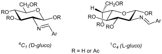 The high coupling constants J2,3 ≈ J3,4 ≈ J4,5 ≥ 9 Hz fully agree with a d-gluco configuration in 4C1 conformation for all the imines derived from 2 and 1C4 (l-gluco) for those based on heptose 6 (Figure 2) [38,39].