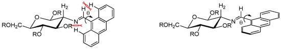 Such NOE effects, together with those determined in other imines from 2 [13], strongly support some key structural features, namely the planarity of the arylimino group, its (E)-configuration, and the fact that the half-plane containing the entire conjugated unsaturated system is approximately perpendicular to the plane of the pyranose ring (Figure 4).