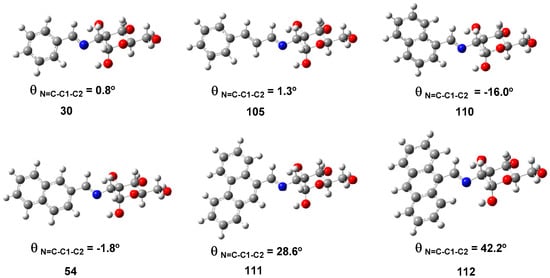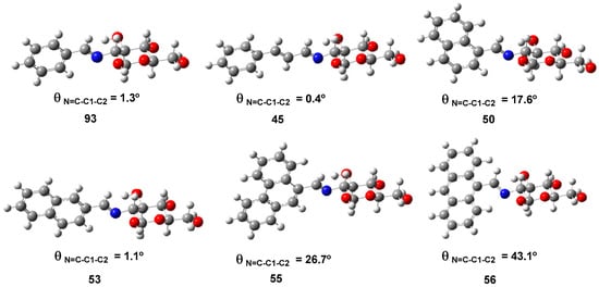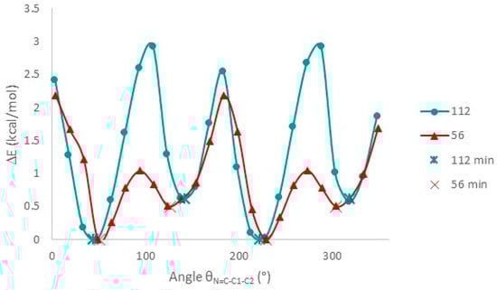 Accordingly, a conformational analysis of the aryl moiety of 56 and 112 has been achieved, and the energy landscape of the arrangements generated around the NC-Carom bond calculated, i.e., by rotating the dihedral angle θN=C-C1-C2 from 0° to 360° with a step size of 15° each. The DFT study was performed using the 6-311G(d,p) [42,43] and def2-TZVP valence-triple-ζ [44] basis sets, with all geometries optimized in the gas phase at the B3LYP [45,46] and M06-2X [47] levels of theory without any geometrical restriction. The M06-2X/def2-TZVP combination has been reported to provide suitable geometry optimization in terms of cost and accuracy for carbohydrate derivatives [48,49,50]. Solvent effects were simulated using the SMD method [51]. Such results are shown in Figure 6 and Table 2.