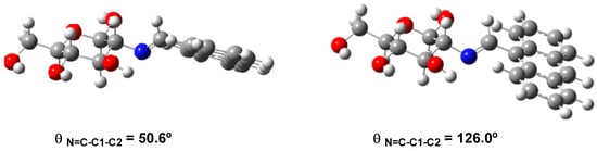 The graph is repeated every 180°, and the two minima obtained are almost identical for both anomers, the most stable conformers corresponding to dihedral angle values θN=C-C1-C2 from ~40° to 50° (Figure 7). In other words, the minima represent a compromise to reach electron delocalization while reducing steric hindrance. Calculations using the 6-311G(d,p) basis set afford similar results for both anomers. However at the def2-TZVP level, the angle rotated by the β-anomer to reach the first minimum is similar, but in the opposite direction (−40° to −43°). The calculated conformation corresponding to the most stable point for other polynuclear imines shows dihedral angle values θH2-C2-N=CH from ~0° to 7° (vide infra); the identical conformation is inferred from NOE effects.