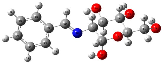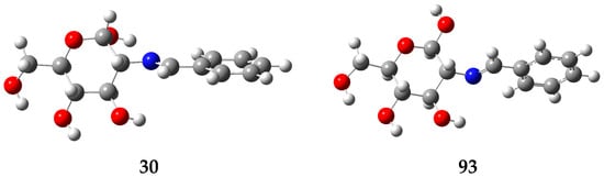 A computational study to determine the relative stability of the different species involved in mutarotational equilibria appears to be a compulsory task. The simplest imine pair derived from benzaldehyde (30/93) was selected to shorten the computational cost. The number of possible conformations is exceedingly high: the three staggered conformations of three hydroxyls and the iminic substituent of the pyranose ring, together with the nine (3 × 3) conformations adopted by the hydroxymethyl group at C-5, which amount to 36 = 729 conformations for each anomer. Some simplifications can be envisaged for the hydroxyl groups, taking into account that the most stable conformations will be those leading to intramolecular hydrogen bonding. We then considered several dispositions, and the most stable conformers correspond to 30 and 93, which differ only by the orientation of the anomeric OH group (Figure 8). This hydroxyl is oriented towards the electron pair of the nitrogen atom, enabling an intramolecular hydrogen bond in the α-anomer (30). In the β-anomer, that hydroxyl is arranged along the direction of the endocyclic oxygen (93). This methodology reduces drastically the number of structures to be calculated.