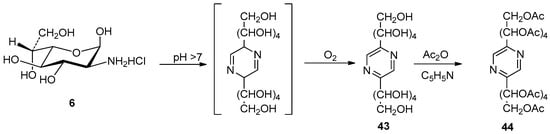 When 2,4,6-trimethylbenzaldehyde was employed, the corresponding imine 42 was not obtained; instead, 2,5-bis-(d-galacto-pentitol-1-yl)pyrazine (43) was isolated, the latter formed by self-condensation of 6 in basic medium (Scheme 2). This substance was characterized through its deca-O-acetyl derivative 44, prepared by conventional acetylation. The generation of this type of heterocyclic compound from alkaline solutions of d-glucosamine, d-mannosamine and d-fructosamine is well documented in the previous literature [18].