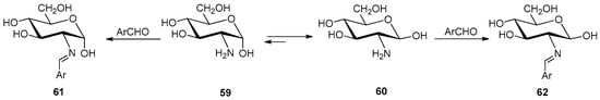 Clearly, the synthesis of α-anomers 30, 31, 52 and 54 is interesting, because only one related case having this abnormal configuration has been described in our previous study, involving the reaction of 2 with 18 [13]. All reactions took place in hydroalcoholic media by treating 2-aminoaldose hydrochlorides with sodium hydroxide or sodium bicarbonate to release the free bases of the α-anomers (59). Interconversion then occurs between the two anomers (59, 60), which condense with the aryl aldehyde present (61, 62) (Scheme 3). Reactions are often heated at ~60 °C for a few minutes, because the aromatic aldehyde can be poorly soluble at room temperature.