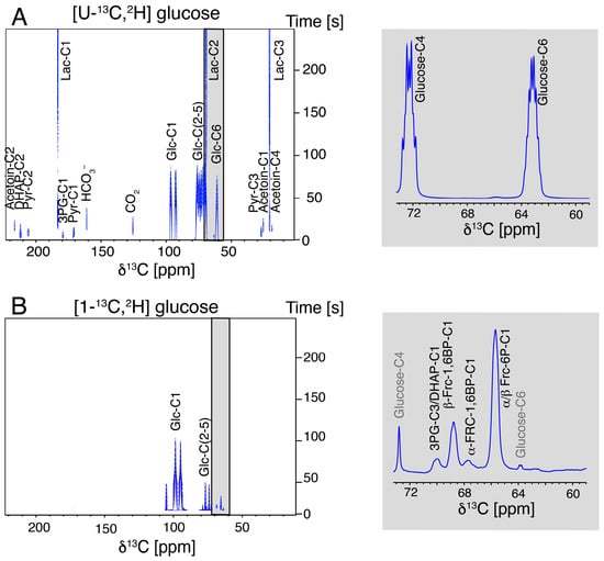 Comparison of the real-time observation of glucose influx into metabolites of L. lactis (MG1363) at 303 K using (A) hyperpolarized [U-13C,2H]glucose and (B) hyperpolarized [1-13C,2H]glucose. Grey inserts display the sums of the first 40 spectra in the time course.
