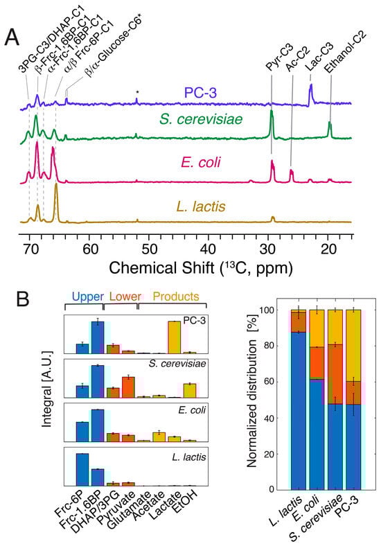 (A) 1D 13C spectra acquired on various cell cultures three seconds after supplying 6 mM hyperpolarized [1-13C,2H]glucose to probe the influx of glucose into the metabolic network, with an emphasis on upper glycolysis. A background signal in the preparation is indicated by an asterisk. (B) Integration and classification of the spectra displayed in (A). Metabolites partition into end products, especially in cancer cells, within 3 s, while increasingly higher fractions of substrate are found in metabolites of upper glycolysis (blue) relative to metabolites of lower glycolysis (red) and end products (orange) for S. cerevisiae, E. coli and L. lactis. Slower glycolysis correlates with lower ratios of fructose-1,6-bisphosphate to fructose-6-phosphate, indicating kinetic control at the phosphofructokinase step especially in L. lactis. Experimental variations of signal areas are indicated for biological replicate cell cultures (n = 2) of the experiments, as shown in (B).