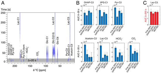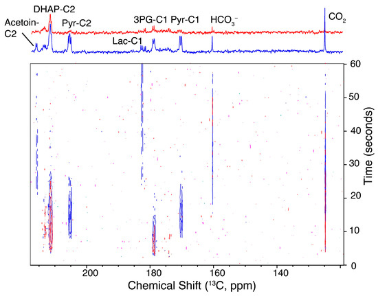 Following the assays showing the effects of different genomes and of different enzyme activities on kinetic barriers in glycolysis, we evaluated if medium composition, nutrition and inhibitors can elicit significant effects on the accumulation of kinetic intermediates in the glycolysis of L. lactis. These measurements were motivated by the fact that L. lactis experiences significantly variable media composition during biotechnological processes. Minor changes in nutrition have been implicated in big metabolic effects [44], as for instance in substrate mixtures [4,22,45], and increases in nutrients can elicit significant changes on a par with genetic engineering, yielding drastic changes in pathway usage [4]. Initially, we attempted to visualize the effects of inhibiting individual enzyme activity in a time-resolved manner using 6 mM hyperpolarized [U-13C,2H]glucose substrate. Sufficiently inhibited enzyme activities are expected to obstruct glycolytic kinetics, an effect that also had been observed for low-level expressions of glycolytic enzymes [43]. We explored the effect of exposing L. lactis to 200 μM iodoacetate for 15 min, since iodoacetate is known for its ability to irreversibly inhibit GAPDH [46], prior to observing intracellular kinetics. The resultant time-resolved spectra for pre-steady-state glycolysis are shown in Figure 5 and the reproducibility is indicated in Figure S5. Experiments in the presence of iodoacetate show that glucose indeed can partition to metabolites upstream of GAPDH, specifically DHAP. By contrast, the absence of conversion to the metabolites of lower glycolysis (such as pyruvate) and of excreted products (such as acetoin) is evident in the presence of iodoacetate. These observations somewhat reflect observations of treatment responses in human cells with hyperpolarized NMR [47,48], and indicate that functional screening of xenochemicals can pinpoint sites of action in microorganisms.
