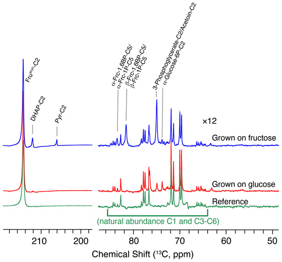 Metabolic adaptation of L. lactis to growth on either glucose (red) or fructose (blue) as the carbon source. Influx of hyperpolarized [2-13C]fructose into cellular metabolites is shown for both cases using a 90° excitation pulse after three seconds of injection to cell suspension, alongside a reference spectrum of the hyperpolarized [2-13C] fructose (green) without L. lactis cells (yielding a weak background of protonated C1 and C3–C6 positions from fructofuranoses and fructopyranoses). Signals below 90 ppm are scaled by a factor of 12 relative to signals above 195 ppm.