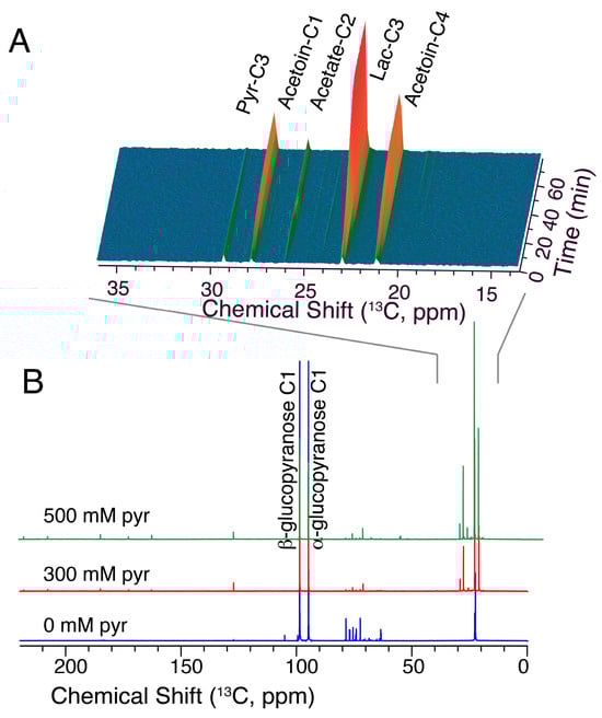 Repeating hyperpolarized NMR assays in the presence of 100 mM exogeneous pyruvate indicated a more efficient and faster influx of glucose-derived carbon into acetoin: the influx of glucose into acetoin, CO2 and HCO3– was increased in the presence of 100 mM exogeneous pyruvate during the initiation of glycolysis by a bolus of hyperpolarized [U-13C,2H]glucose (Figure 7). Thus, the ratio of the acetoin C2 signal relative to the lactate C1 signal increased from 0.27 ± 0.08 in the absence of added pyruvate to 1.17 ± 0.08 in the presence of 100 mM exogeneous pyruvate (with errors deriving from biological replicates with n = 2). Previous studies using 21 mM pyruvate/9 mM glucose substrate mixtures had indicated changes to glycolysis and fermentation in resting citrate-positive L. lactis using conventional NMR detection, albeit negligible formation of acetoin from glucose had been described under these conditions [52]. Beyond providing insight into glycolytic dynamics and responses, the modulation of EMP glycolysis to provide C4 products such as acetoin from non-fossil resources has attracted considerable attention [50,53,54,55] and has included approaches for biotechnological production in L. lactis strains lacking lactate dehydrogenase [54]. Hence, we were interested in tracking acetoin product accumulation with wild-type L. lactis under steady-state conditions on a minutes-to-hours timescale using glucose/pyruvate substrate mixtures at intensified conditions with high carbohydrate and pyruvate concentrations. Resultant product mixtures were characterized using 100 mM [1-13C]glucose in conventional NMR assays (Figure 8) in the absence and in the presence of external pyruvate. External pyruvate was added to final concentrations of 300 mM and 500 mM in addition to a reference experiment in the absence of added pyruvate.