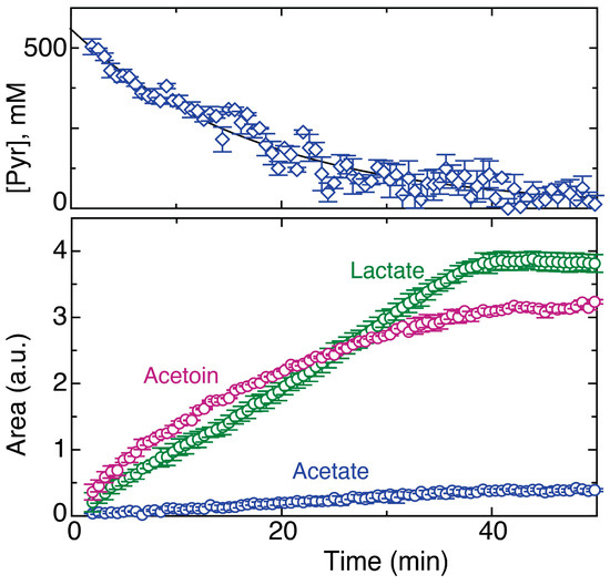 Time course of the influx of the C1 carbon of 100 mM [1-13C]glucose in the presence of 500 mM unlabeled pyruvate into acetoin (sum of C1 and C4 signals), lactate and acetate. The corresponding time course of pyruvate decay as tracked by signal areas at natural 13C isotope abundance is shown in the top panel. Experimental errors for biological replicate cell cultures (n = 2) are shown.