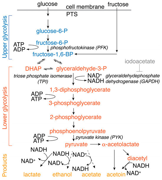 Schematic overview of Embden–Meyerhof–Parnas glycolysis commencing from glucose (taken up via the phosphotransferase system (PTS)) or fructose, and of pyruvate metabolism to fermentation products in L. lactis. The effects of inhibition by iodoacetate were probed alongside the effects of changing TPI, GAPDH and PYK enzyme levels.