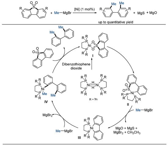 In 2008, García and co-workers developed the desulfonylative functionalization of dibenzothiophene dioxides with methyl magnesium bromide (MeMgBr) catalyzed by nickel-complexes (Scheme 3) [15]. A series of nickel complexes including [Ni(dippe)H]2, [Ni(dcype)H]2, [Ni(dtbpe)H]2, or [Ni(dippe)(Me)2] in mixed solvents of toluene and THF could yield methyl biaryl or dimethyl biaryls in moderate to good yields. Dibenzothiophene dioxides reacted with 6.0 equivalents of MeMgBr to give dimethyl biaryls in quantitative yields in the presence of low nickel catalyst loading (1.0 mol%). As shown in the proposed catalytic cycle, the reaction of [Ni(dippe)H]2 with dibenzothiophene dioxide yields a nickel-complex I. Further oxidative addition of C(sp2)–SO2 bond followed by extrusion of SO2 with the aid of MeMgBr furnishes cyclic nickel intermediate III. The intermediate III undergoes metathesis with MeMgBr followed by reductive elimination to give dimethyl-substituted biaryls.