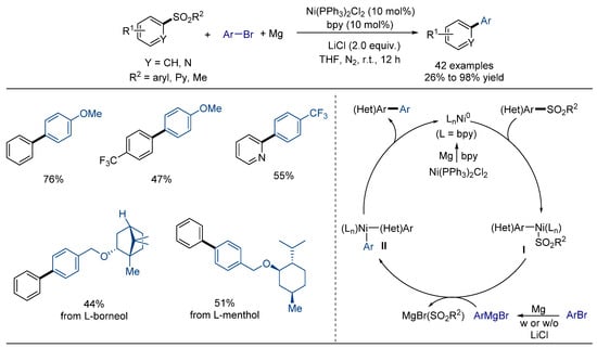Very recently, Xu, Zhou, and Shen’s group established a Ni-catalyzed cross-coupling of inactivated (hetero)aryl sulfones with aryl bromides at ambient temperature with the assistance of excess magnesium powder (Scheme 4) [16]. Control experiments indicated that Ni(PPh3)2Cl2, 2,2′-bipyridine ligand (bpy), magnesium powder, and THF are all indispensable for the successful realization of the reaction. A variety of (hetero)aryl sulfones and aryl bromides were well compatible under the optimized conditions with/without LiCl, enabling the facile synthesis of biaryl compounds with moderate to high yields. It was noteworthy that the late-stage desulfonylative coupling reactions with complex molecules derived from L-borneol and L-menthol also proceeded smoothly under the established conditions, affording the corresponding product in moderate yields. In addition, the practical utility of this cross-coupling was demonstrated by performing a 5 mmol scale reaction, delivering the final products in 66% yield. For unsymmetrical (hetero)aryl sulfones, the desulfonylative cross-coupling reaction occurred selectively through the cleavage of the more electron-poor aryl C(sp2)–SO2 bond. Initially, the reduction of Ni(PPh3)2Cl2 by Mg powder generates active Ni(0) species, which undergo oxidative addition with aryl sulfones (ArSO2R2) to produce an Ar–Ni(II)–SO2R2 complex I. Meanwhile, the reaction of aryl bromides with Mg powder with/without the aid of lithium chloride produces the active aryl magnesium compounds. The subsequent transmetallation between intermediate I and Grignard reagents affords the biaryl-nickel intermediates II, which finally undergo reductive elimination to generate the desired diaryls.