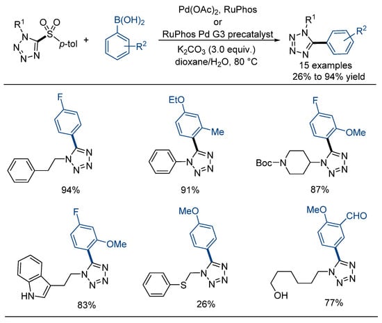Twelve years later, the possibility of N-heteroaryl sulfones to participate in Pd-catalyzed Suzuki–Miyaura-type cross-coupling reaction was further investigated by Hennessy and co-workers (Scheme 6) [18]. The synthesis of 1,5-disubstituted tetrazoles was successfully realized through desulfonylative cross-coupling of readily prepared 5-p-toluenesulfonyltetrazoles with boron-based nucleophiles including boronic acids, pinacolboronate esters, and trifluoroborate salts. The use of biaryl phosphine ligands such as RuPhos was essential for achieving higher yields. The protocol is compatible with a variety of 5-p-toluenesulfonyltetrazoles and organoboron compounds with diverse functional groups. It is noteworthy that a 5-p-tolylsulfonyltetrazole substrate containing the bromoaryl group underwent Pd-catalyzed Suzuki–Miyaura cross-coupling reaction selectively through the cleavage of aryl C–Br bond, thus providing new opportunities for step-wise construction of polyaryls.