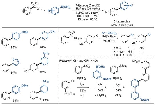 - Chatelain, P.; Sau, A.; Rowley, C.N.; Moran, J. Suzuki–Miyaura Coupling of (Hetero)Aryl Sulfones: Complementary Reactivity Enables Iterative Polyaryl Synthesis. Angew. Chem. Int. Ed. 2019, 58, 14959–14963. [Google Scholar] [CrossRef]