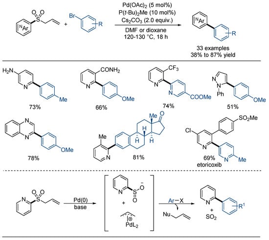 Pd-catalyzed cross-coupling of allyl heteroaryl sulfones with aryl halides.