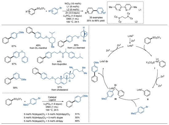 Very recently, the Ni-catalyzed reductive cross-coupling of arylsulfones with aryl bromides was realized by Ma and co-workers (Scheme 10) [25]. In this protocol, trifluoromethyl arylsulfones showed the best result, while other arylsulfones containing CF2H, CH3, Ph, and F instead of the CF3 group resulted in poor or no efficiency. By using 10 mol% of NiCl2 as the catalyst, the combination of 6 mol% of dmbpy and 6 mol% of dcype as ligands, and Zn powder as reductant, a variety of functionalized biaryl compounds were obtained with moderate to good isolated yields. However, aryl (trifluoromethyl) sulfones containing strong electron-withdrawing groups such as ketone, ester, and cyano groups failed to afford the desired product. In addition, the applicability of this method was then investigated using several aryl bromides derived from natural products and drug molecules such as ibuprofen and cholesterol, affording the desired products in moderate yields.