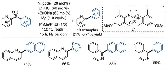 Without the addition of coupling reagents, transition metal-catalyzed intramolecular desulfonylative coupling reactions occurred in some cases. In 2018, Yorimitsu and co-workers developed a Ni-catalyzed intramolecular desulfonylative coupling of π-extended N-hetero-2-aryl arylsulfones (Scheme 11) [26]. In the presence of 20 mol% of Ni(cod)2, 40 mol% of ligand, 60 mol% of t-BuONa, and one equivalent of Mg, sulfones with π-extended N-aromatic rings and arylsulfonyl group at ortho-nitrogen carbon atom were well compatible to the corresponding unsymmetric biaryls with moderate to high yield. However, sulfones containing 2-pyridyl, 2-pyrazinyl, and 3-/4-quinolyl rings showed much lower efficiency or were completely inert under the optimized conditions.