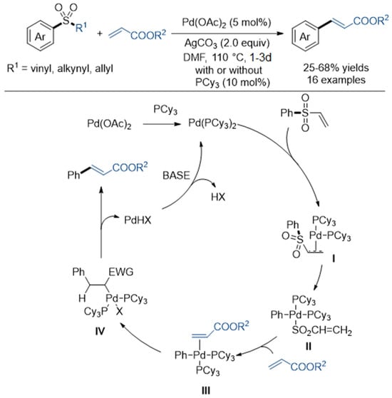 In 2006, Ruano and co-workers reported a Pd-catalyzed Mizoroki–Heck-type reaction of alkenyl or alkynyl aryl sulfones with acrylate esters (Scheme 13) [28]. By using Pd(OAc)2/PCy3 as the catalyst and Ag2CO3 as an additive, the cleavage of aryl C(sp2)–SO2 bond within alkenyl or alkynyl aryl sulfones proceeded primarily, leading to further arylation of acrylate esters to form cinnamyl esters. Diphenyl sulfone or methyl phenyl sulfone were unreactive under the optimal conditions, suggesting that coordination of the π-bond of the alkene and alkyne moiety to palladium center is likely involved. As shown in the proposed catalytic cycle, the coordination of the π-bonds followed by oxidative addition to Pd-species affords the intermediate II. Then, coordination and insertion of π-bond in the acrylate ester generates an alkyl-Pd species III, which undergoes the β-elimination process to give the desired product.