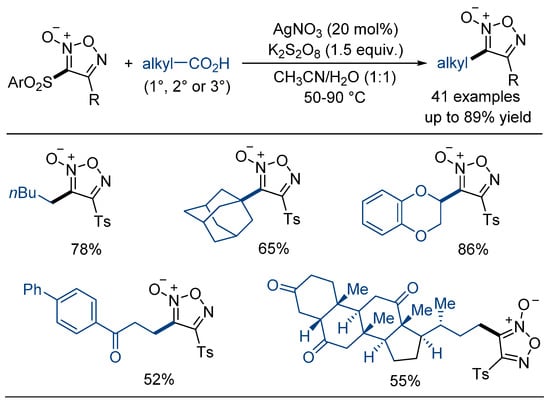 Transition metal-catalyzed desulfonylative cross-coupling reactions of (hetero)aryl sulfones with radical precursors have also been achieved. In 2020, Matsubara and co-workers developed the Ag-catalyzed radical cross-coupling of arylsulfonyl-substituted furoxans with aliphatic carboxylic acids (Scheme 14) [29]. A variety of primary, secondary, and tertiary alkyl carboxylic acids successfully reacted with arylsulfonyl-substituted furoxans to give the corresponding alkyl-substituted furoxans with moderate to good yields. Various functional groups such as ketone, ether, ester, bromo, amine, and aromatic rings, as well as several bioactive and drug skeletons, were well tolerated in this method. Notably, this protocol showed exclusive site-selectivity favoring the cleavage of sulfonyl group at the 3-position of disulfonyl furoxan. The obtained 3-alkyl-4-sulfonyl furoxan products could be further converted into dual-functionalized furoxans, enabling the modular synthesis of diverse functionalities through “build-and-scrap” strategy.