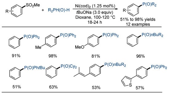 In recent years, the transition metal-catalyzed desulfonylative functionalization reactions to form carbon–heteroatom bonds have also been realized. In 2016, Chen and co-workers developed an efficient Ni-catalyzed desulfonylative cross-coupling of arylsulfones with phosphine oxides (Scheme 15) [30]. This protocol proceeded with both aryl and alkyl secondary phosphine oxides to offer functionalized tertiary-phosphine oxides in good to high yields. The desulfonylative reaction could be performed at 10 mmol scale in high yield with the addition of Ni(cod)2 at a loading of 0.1 mol%. Interestingly, the desulfonylative reaction of arylsulfones bearing ester and cyano groups could work well without nickel catalyst. This protocol provides an efficient method for the construction of C–P bonds. Later, the formation of C–B bond was achieved by the Yorimitsu group through Pd-catalyzed coupling of diphenyl sulfone with diboronates, yet with only one example [31].
