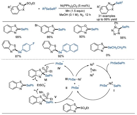 Organic selenium compounds have attracted a lot of attention due to their unique biological activity. Recently, the Wang group developed a Ni-catalyzed cross-coupling reaction of heteroaryl sulfones with diselenides (Scheme 16) [32]. Using 5 mol% of Ni(PPh3)Cl2 as catalyst, excess amounts of Mn powder as reductant, and MeOH or DMF as solvent, various heteroaryl sulfones and diselenides were well compatible to afford the anticipated heteroaryl selenides with moderate to high yields. In this protocol, the nickel catalyst undergoes oxidative addition with diselenide ether to furnish Ni(II)-selenide species I. Then, Ni(II)-selenide species can generate the selenium radical II and Ni(I)-selenide species III, which regenerates active Ni(0) species and the selenium negative ion IV. Finally, radical/nucleophilic addition into C=N double bonds within N-heteroarylsulfones followed by rearomatization releases the sulfite radical/negative ion and the target heteroaryl selenides.