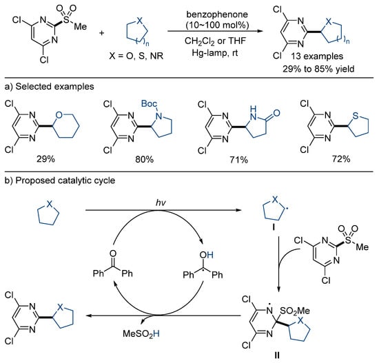 In 2017, the Kamijo group reported a Ph2CO-mediated photoinduced desulfonylative alkylation of sulfonylpyrimidines (Scheme 17) [35]. In the presence of 0.1 or 1.0 equivalent of Ph2CO, the reactions could give various alkylated pyrimidines with moderate to good yields under the irradiation of medium-pressure Hg-lamp at room temperature. In this case, only electron-deficient substrates showed relatively higher yields. A proposed catalytic cycle was illustrated in Scheme 17b. Hydrogen atom abstraction (HAA) of the C(sp3)–H assisted by photoexcited diaryl ketone with the release of the ketyl radical occurs to generate a carbon radical I. The addition of the carbon radical to sulfonylpyrimidines furnishes the radical intermediate II, which undergoes rearomatization in the presence of ketyl radical to provide the desired product.
