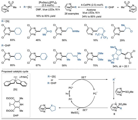 In 2019, Molander and co-workers reported a photoredox-catalyzed desulfonylative alkylation of N-heteroaryl sulfones with alkyl bis(catecholato)silicates or 4-alkyl-1,4-dihydropyridines (DHPs) (Scheme 18) [36]. When using alkyl bis(catecholato)silicates with low oxidation potentials as substrates, the desulfonylative reactions gave the best results in the presence of [Ru(bpy)3][PF6]2. Meanwhile, a variety of 4-alkyl-1,4-dihydropyridines also successfully reacted with the N-heteroaryl sulfones to yield comparable yields using 4CzIPN as the photocatalyst. Primary and secondary alkyl substrates bearing potentially reactive functional groups such as alkenes, esters, alkyl chlorides, amines, and pyrroles were well tolerated. To check the utility of this method, the desulfonylative reaction of a saccharide-derived DHP was subjected to the optimized conditions, yielding the final product in 54% yield with excellent diastereoselectivity. In the proposed cycle, excited photocatalyst by light absorption, followed by SET to the alkyl radical precursor. The newly formed alkyl radical inserts into the heteroaryl sulfone at the α-position relative to the sulfone with the concomitant elimination of a sulfinate anion by SET between the transient aryl radical and the reduced photocatalyst.