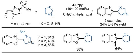 In 2019, the Kamijo group developed similar photoinduced desulfonylative alkylation of sulfone-functionalized benzazoles mediated by 4-benzoylpyridine (4-BzPy) (Scheme 19) [37]. Sulfone-functionalized benzothiazoles, benzoxazole, and benzimidazoles could react successfully to give the desired products in 24–92% yield. However, this protocol required stoichiometric amounts of 4-BzPy as the photocatalyst due to its decomposition during the reaction. Recently, the Xia and Yang group achieved similar transformation through a photoinduced Fe-catalyzed ligand-to-metal charge transfer strategy [38]. In this method, the generated chlorine radical served as the hydrogen atom absorbing reagent.