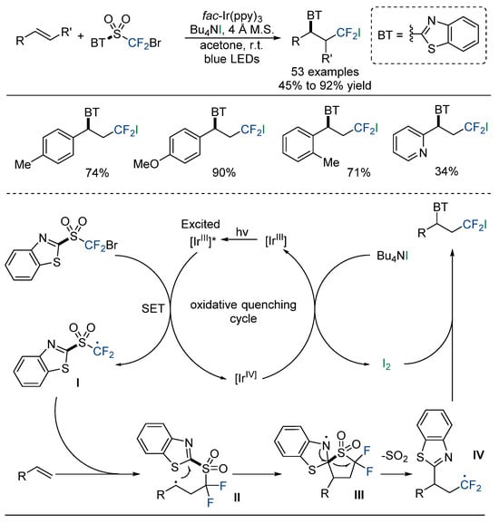Alkenes are ubiquitous in natural products and pharmaceuticals and represent useful feedstocks in synthetic chemistry. The dual difunctionalization of alkenes provides a powerful route for olefin utilization. In 2018, Zhu and co-workers developed a conceptually new docking–migration strategy for radical difunctionalization of alkenes using bromodifluoromethyl N-heteroaryl sulfones (Scheme 21) [41]. This protocol employed fac-Ir(ppy)3 as photocatalyst (2 mol%) and blue LEDs as light source (14 W). Under the standard conditions, both aryl alkenes and inactivated aliphatic alkenes were suitable substrates for this reaction, leading to formation of diverse heteroaryl- and difluoromethyl-difunctionalized alkanes. It is noteworthy that the final products could be further converted into synthetically valuable fluorine-containing molecules. As shown in Scheme 21, the bromodifluoromethyl N-heteroaryl sulfone undergoes SET process with excited Ir(III)* to generate difluoromethyl radical species I and Ir(IV) complex. Then, addition of I to an alkene gives the active alkyl radical intermediate II, which simultaneously undergoes intramolecular cyclization to form a five-membered spiro-N-radical III. Next, aromatization and extrusion of SO2 results in the difluoroalkyl radical IV. Finally, the in situ formed iodine from the reaction of TBAI with Ir(IV) complex reacts with intermediate IV to yield the final difunctionalized product and regenerate the Ir(III) catalyst.