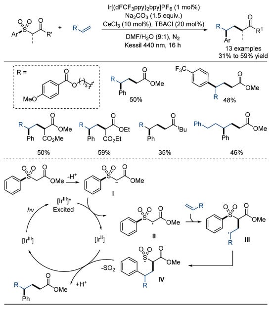 - Paul, B.; Paul, H.; Chatterjee, I. Photoredox-Mediated Desulfonylative Radical Reactions: An Excellent Approach Towards C–C and C–Heteroatom Bond Formation. Synthesis 2022, 54, 5409–5422. [Google Scholar] [CrossRef]