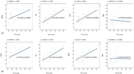 Results obtained from Pearson’s correlation analysis for (a) DBS samples and (b) plasma samples. aPTT—activated partial thromboplastin time, PT—prothrombin time, INR—international normalized ratio, DD—d-dimers.