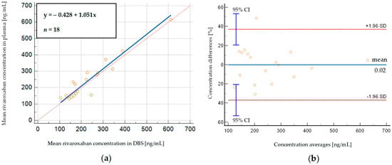 (a) Deming regression of rivaroxaban concentrations measured in DBS whole-blood samples, displayed against simultaneously analyzed plasma samples obtained from patients; (b) Bland–Altman plot, depicting % differences between DBS—predicted and measured plasma rivaroxaban concentrations. SD—standard deviation, 95% CI—95% confidence interval.