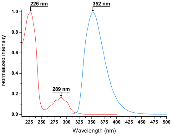 The UV-vis absorption spectrum of C4N4-Me (Figure 2) in n-hexane is characterized by an intense band peaking at 226 nm (ε = 22,100 M−1 cm−1) and a broad band at 289 nm (ε = 35,900 M−1 cm−1). The band at 289 nm exhibits an electronic transition rich in vibronic structure. The spectrum shows significant similarities to those of phenol-, anisole-, and 2,3-dimethoxynaphthalene-based derivatives. The fluorescence spectrum of C4N4-Me was then collected using excitation wavelengths of 226 nm or 289 nm. When the solutions of C4N4-Me were irradiated at 226 nm, an intense emission band was observed at 352 nm, with a fluorescence quantum yield of Φ = 0.69.