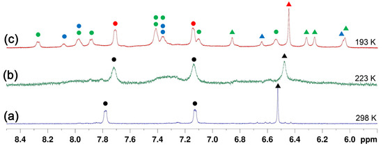 Aromatic portions of the 1H NMR spectra of C4N4-Me in CD2Cl2 at 600 MHz at (a) 298 K, (b) 223 K, and (c) 193 K. The signals of the aromatic hydrogen atoms of the naphthalene rings and phenol units are marked with circles and triangles, respectively. Blue, green, and red signals correspond to the 1,5-alternate (1), 1,3,5-alternate (1), and 1,3,5,7-alternate conformations, respectively.