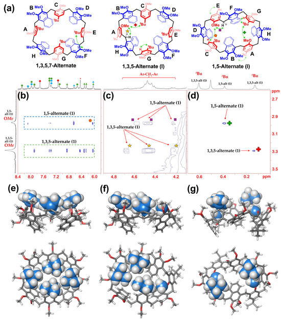 Chemical drawing of (a) 1,3,5,7- alternate, 1,3,5-alternate (1), and 1,5-alternate (1) conformations obtained by molecular dynamics calculation. (b–d) Significant portions of the 2D-NOESY spectrum of C4N4-Me (CD2Cl2, 600 MHz, 193 K). The signals of the aromatic hydrogen atoms of the naphthalene rings and phenol units are marked in “b” with circles and triangles, respectively. Blue, green, and red signals are attributable to 1,5-alternate (1), 1,3,5-alternate (1), and 1,3,5,7-alternate conformations, respectively. (e–g) Self-filling of the cavities of C4N4-Me in 1,3,5,7- alternate, 1,3,5-alternate (1), and (c) 1,5-alternate (1) conformations, respectively, obtained by molecular dynamics calculation in top and side views.