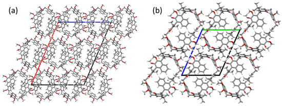 The crystal packing of C4N4-Me and C4N4 is shown in Figure 8. For C4N4-Me, the central cavities of the macrocycle are aligned along the b-axis. However, the eight aromatic rings, all tilted inwards as described above, effectively close off the cavity above and below. In the case of C4N4, the macrocycle cavities are aligned along the a-axis. The two inward-oriented naphthalene rings lie quite flat with respect to both the mean plane of the methylene groups (dihedral angles = 30.21°) and the bc plane. This configuration divides each cavity into two opposing sections resembling two ¾ partial cones, with the fourth ring being flat rather than inverted. Each of these sections forms isolated cavities with the corresponding sections of adjacent molecules stacked along the a-axis.