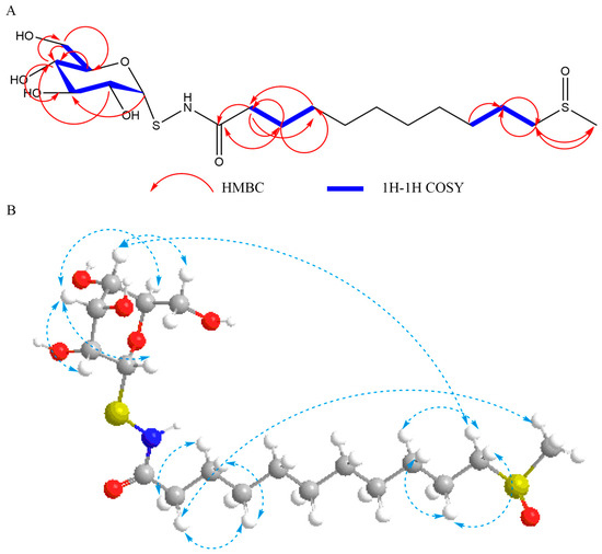 1H-1H COSY, HMBC, and NOESY correlations of bursapastoris A. (A) 1H-1H COSY and HMBC correlations; (B) NOESY correlation (light blue dashed arrow), white: hydrogen; grey: carbon; red: oxygen; yellow: sulfur.