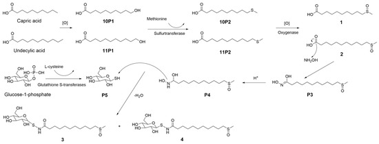 A plausible biogenetic pathway [18] was proposed for the formation of these organosulfur compounds, involving the following key steps (Figure 4): (1) an oxidation reaction converted fatty acids to 10P1 and 11P1; (2) the enzymatic catalytic reaction of 10P1 or 11P1 and methionine to 10P2 or 11P2 was catalyzed by sulfurtransferase; (3) the thioether was easily oxidized into compounds 1 and 2 by oxygenase; (4) P3 was derived from compound 2 through a reaction with a hydroxyamine unit; (5) protonation of P3 leads to a proposed intermediate P4; (6) P5 was derived from glucose-1-phosphate through a reaction with an L-cysteine unit; (7) compounds 3 and 4 were derived from the combination of P4 with P5 by the leaving of H2O.