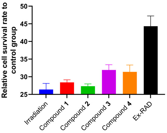 In the investigation of the activity of compounds 1–4, it was observed that they did not exhibit any significant anti-inflammatory, anti-tumor, or anti-oxidation properties. However, organosulfur compounds have been known to demonstrate promising effects in protecting against radiation damage, such as diallyl sulfide [19], cysteamine [20], amifostine [21,22], and others. Therefore, it is intriguing to explore whether compounds 1–4 (four natural organic sulfur compounds) possess potential for mitigating radiation-induced damage. The anti-radiation activities of compounds 1–4 were evaluated using X-ray irradiated AHH-1 cells as a model, and the result showed that the four organosulfur compounds had weak radioprotective effects (Figure 5).