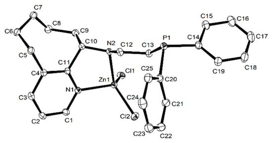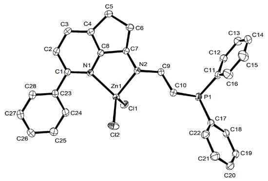 The single crystals of Zn2, Zn3, Zn7 and Zn8 suitable for X-ray determination were obtained by diffusing diethyl ether into a dichloromethane solution. Their crystal structures are depicted in Figure 1, Figure 2, Figure 3 and Figure 4, respectively, and the selected bond lengths and angles are summarized in Table 1. The molecular structures of Zn2, Zn3, Zn7 and Zn8 are similar, in which the zinc is four-coordinated by two nitrogen atoms and two chlorine atoms to form a distorted tetrahedral geometry. Similar to our previous reports [51], the phosphorus donor did not coordinate to zinc, which agreed well with the little shift in its 31P NMR spectra.